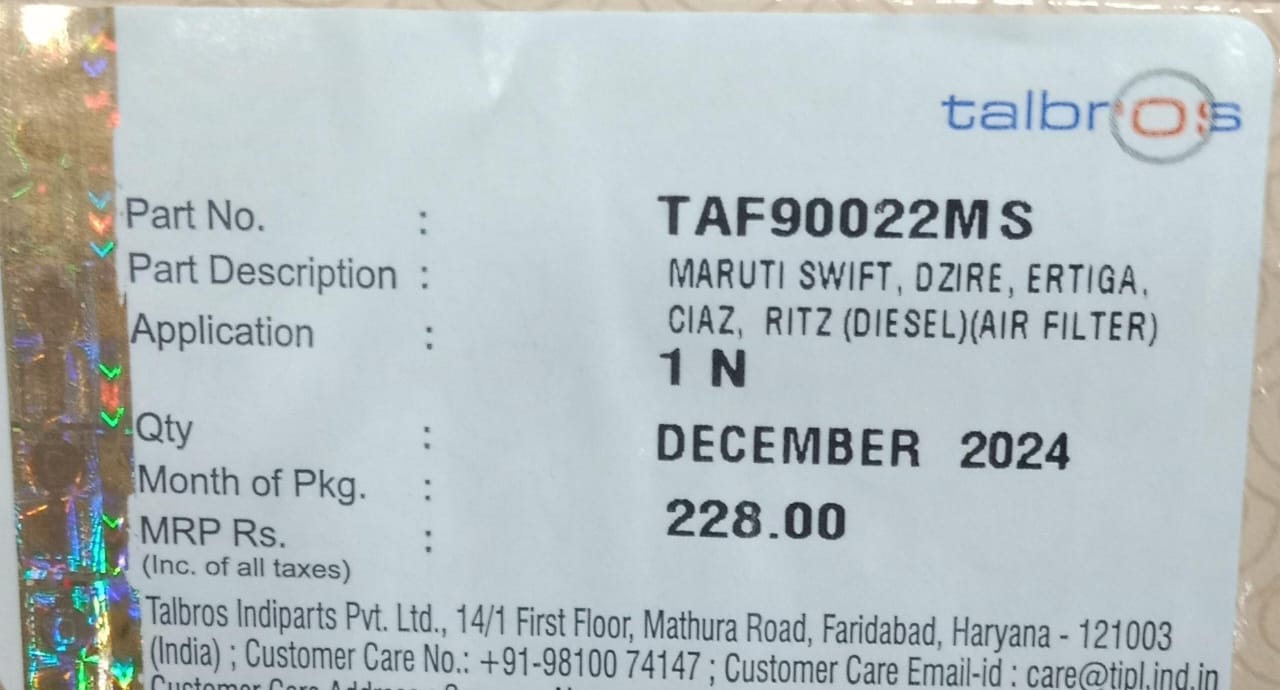 (TALBORS) AIR FILTER DZIRE, ERTIGA, RITZ, SWIFT-DIESEL REF: 0126